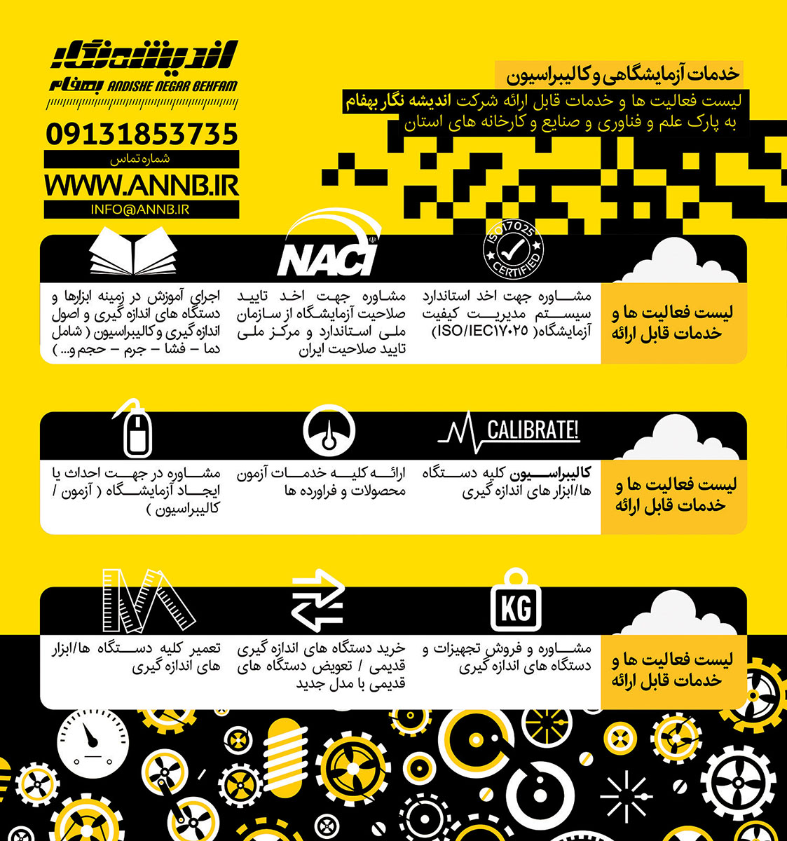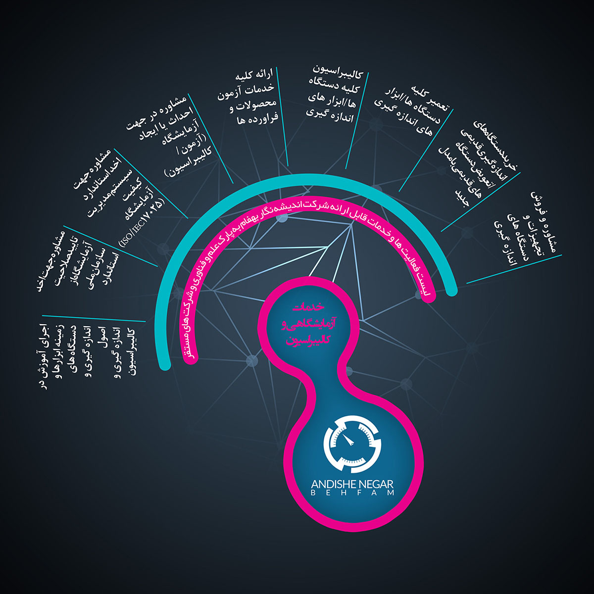این شرکت باتوجه به تجربه مناسب و مؤثری که در زمینه تجهیزات آزمایشگاهی و آزمون دارا است و همچنین خلاء وجود یک آزمایشگاه کالیبراسیون در استان، اقدام به ایجاد و تجهیز اولین آزمایشگاه کالیبراسیون در استان چهارمحالوبختیاری نمود و در حال حاضر در زمینه دو کمیت دما و فشار در گستره مناسب و با توان اندازهگیری بالا آماده ارائه خدمات کالیبراسیون به صنایع استان میباشد.
